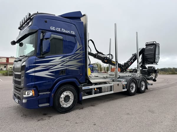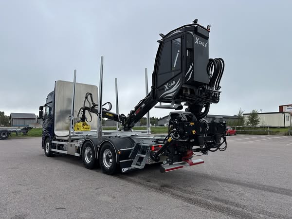 Påbyggnation utförd av OP Höglunds och utrustad med en Loglift 108 manuell med dubbel utskjut – redo för tunga uppdrag och många mil på vägarna.